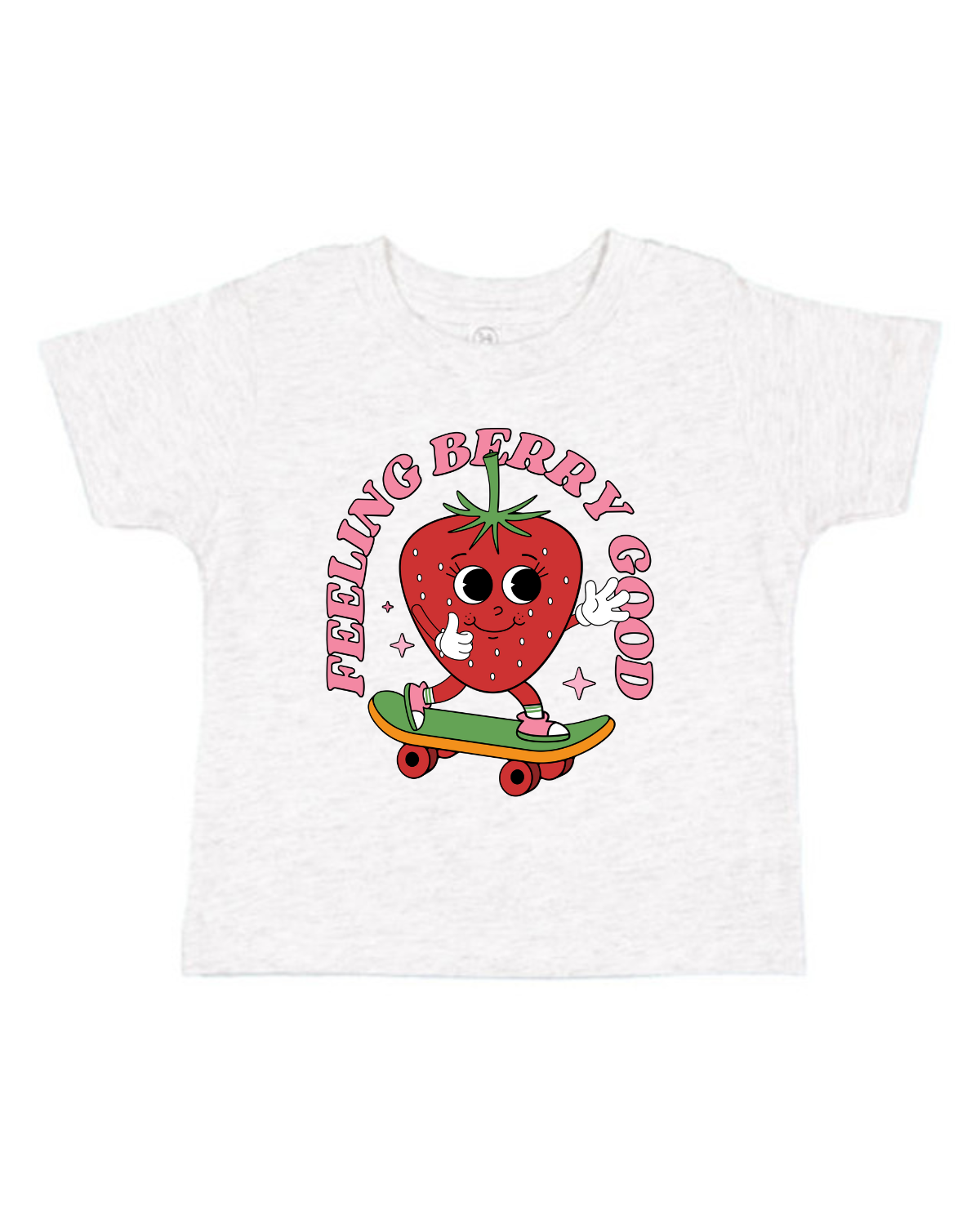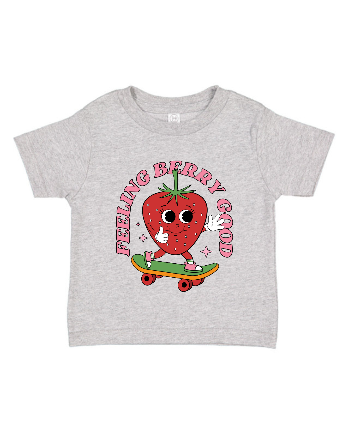 Make your toddler's day brighter with the "Feeling Berry Good" Toddler T-Shirt! This fun and playful tee features an adorable strawberry character riding a skateboard, surrounded by the cheerful text "Feeling Berry Good." Crafted from soft, breathable cotton, this t-shirt ensures your little one stays comfortable while looking stylish and trendy.
